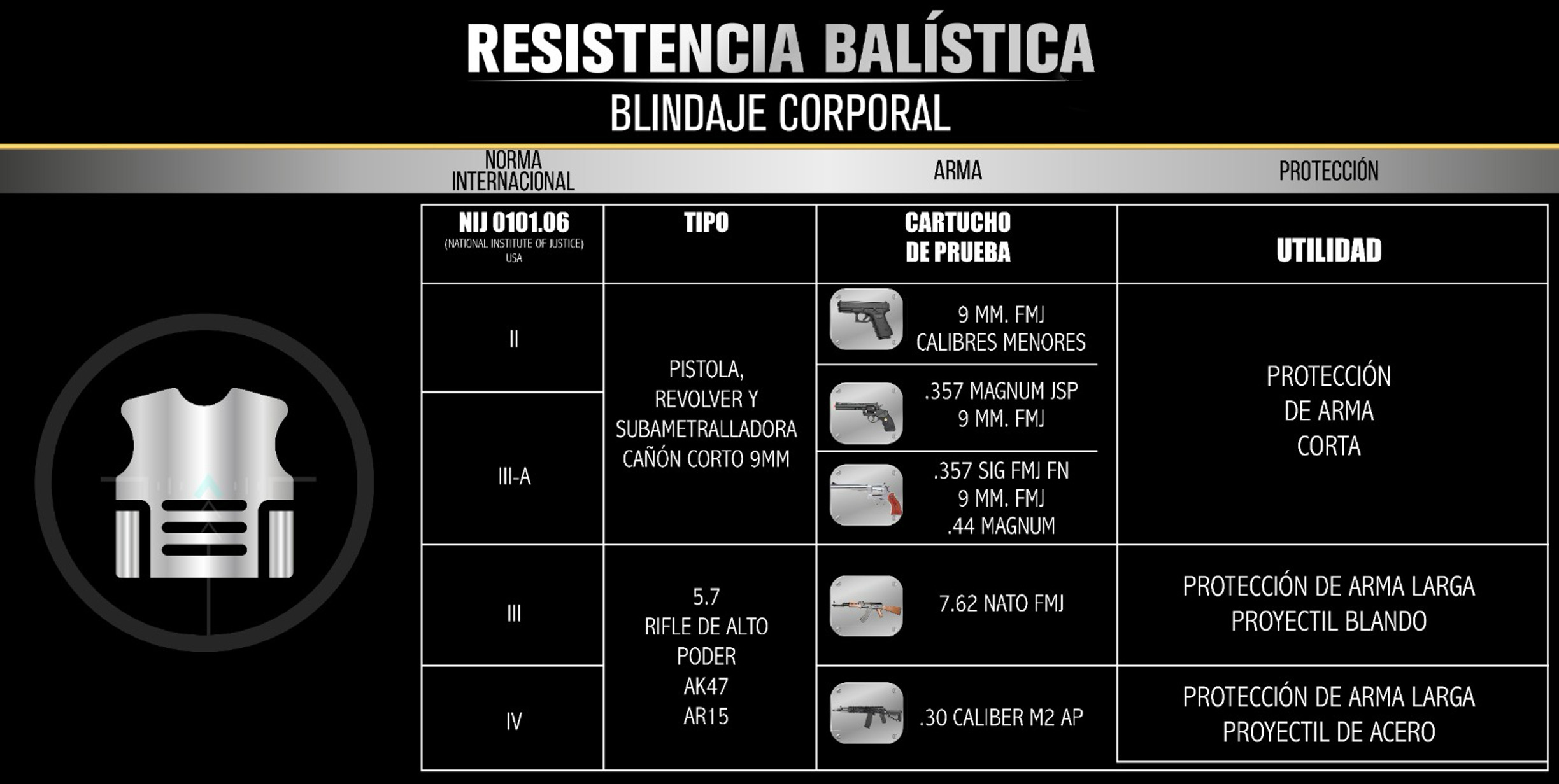 Seguridad personal, Protección contra municiones y explosivos, Tranquilidad, Valor de inversión, Versatilidad, Tecnología avanzada.